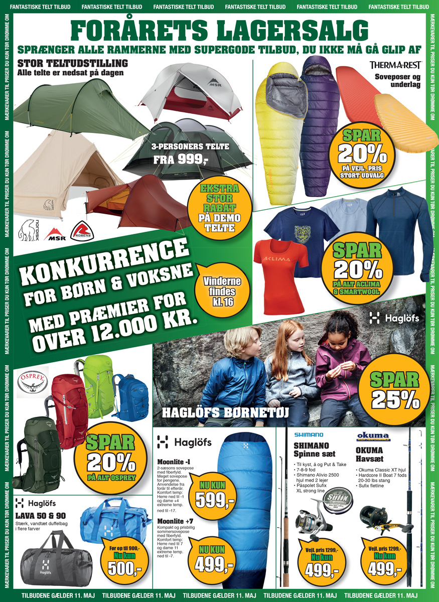 Den 11. maj 2018 holder PH-Outdoor lagersalg fra 9-17, hvor der vil være tilbud på blandt andet sandaler, kollektionsprøver, Osprey rygsække, Telte, Haglöfs børnetøj og meget mere.